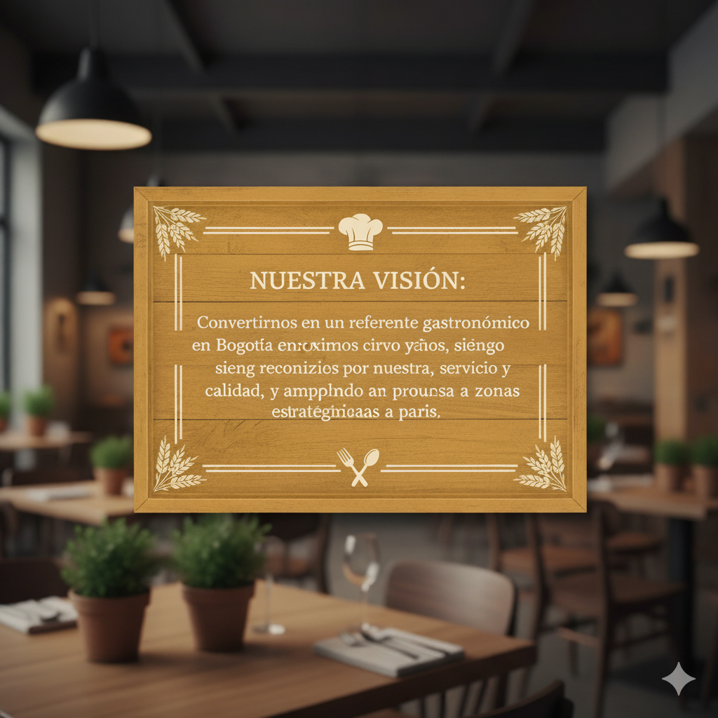 Convertirnos en un referente gastronómico en Bogotá en los próximos cinco años, siendo reconocidos por nuestra identidad, servicio y calidad, y ampliando nuestra propuesta a nuevas zonas estratégicas del país.